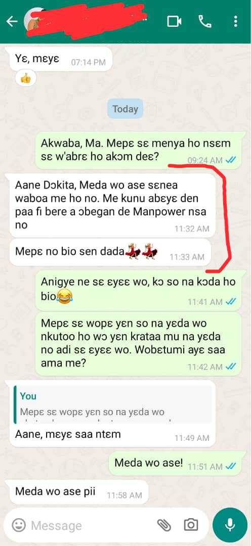 Mene ɔbarima na mete no yie. Merekasa no na ɛyɛ mmerɛ a, minim nea mereka.