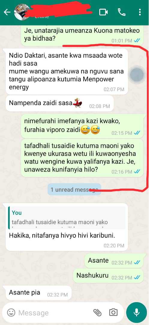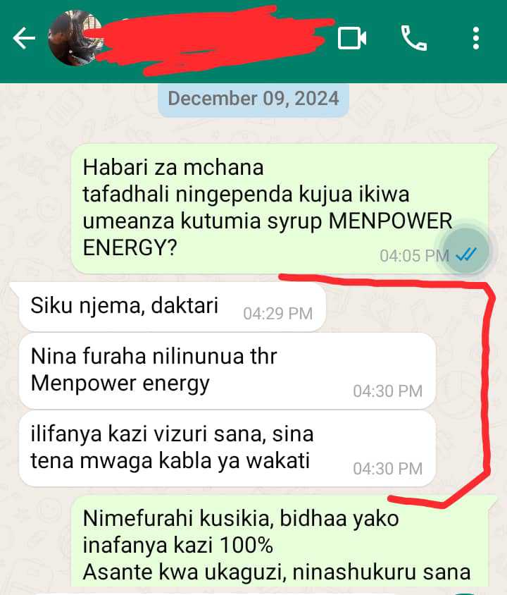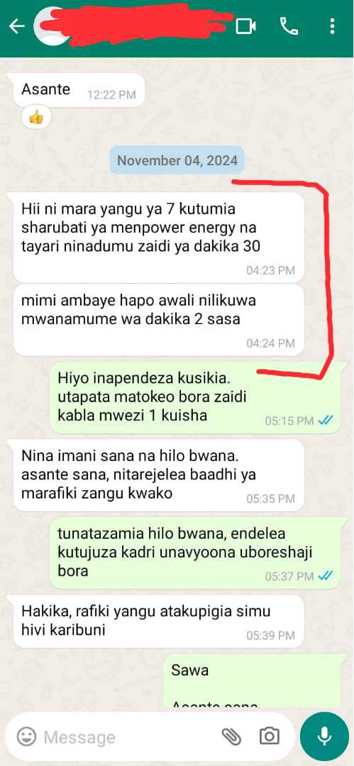 Moja: Unaweza kuagiza MENPOWER ENERGY na kufanya wakati wako wa mapenzi kuwa wa kipekee, kumfanya mwanamke wako ajivunie wewe, na kujisikia kama mwanaume halisi.
